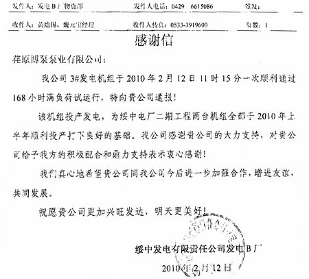 2009年9月27日8時(shí),海門(mén)一期4 *1000MW國(guó)產(chǎn)臨界機(jī)組,#2機(jī)圓滿完成了168小時(shí)滿負(fù)荷運(yùn)行,順利投產(chǎn)發(fā)電。海門(mén)電廠特地為我公司發(fā)來(lái)感謝函,對(duì)我公司的優(yōu)良服務(wù)表示感謝。海門(mén)一期4 *1